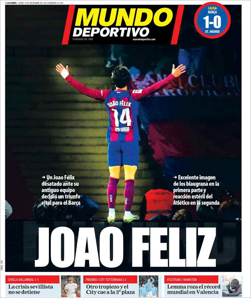 La prensa cataculé escoge la misma foto de su héroe de la noche para ilustrar su portada. “João Feliz”, titula Mundo Deportivo. No se había visto juego de palabras más ocurrente desde el célebre “Posh can’t push” del nacimiento por cesárea del mayor de los Beckham.