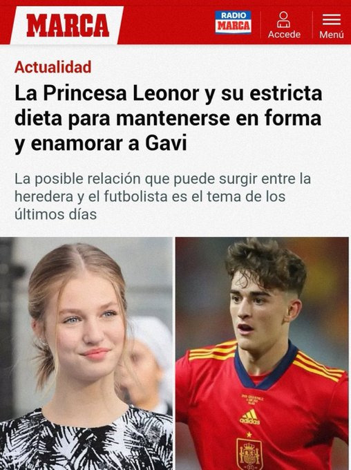 Pero vamos a ver, Marca. Que son NIÑOS, y que aquí hay en juego cosas más importantes que arañar unos clicks con cosas del corazón ahora que el mundial ha muerto para los fans de la selección y ya no queda nada que rascar. Aquí está en juego la salud mental de una generación con muchas amenazas para la misma, especialmente en su vertiente femenina. Que nos vengáis con los presuntos cuestiones de dieta de una menor de edad para mantenerse en forma y "enamorar a Gavi" tiene en el tufo rancio de ese titular el menor de sus problemas. ¿Necesitamos contaros en qué consiste el devastador desorden de la anorexia, y la importancia de controlar al máximo los mensajes que se transmiten en este sentido, máxime si. como decimos, hablamos de una menor de edad? ¿De verdad tenemos que subrayar la decadencia ética y estética en la que entráis con cosas como estas?