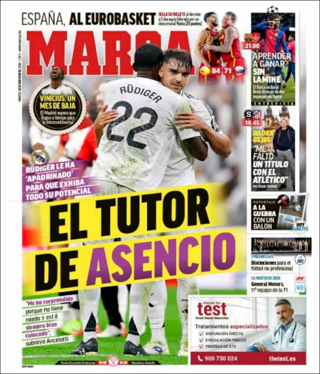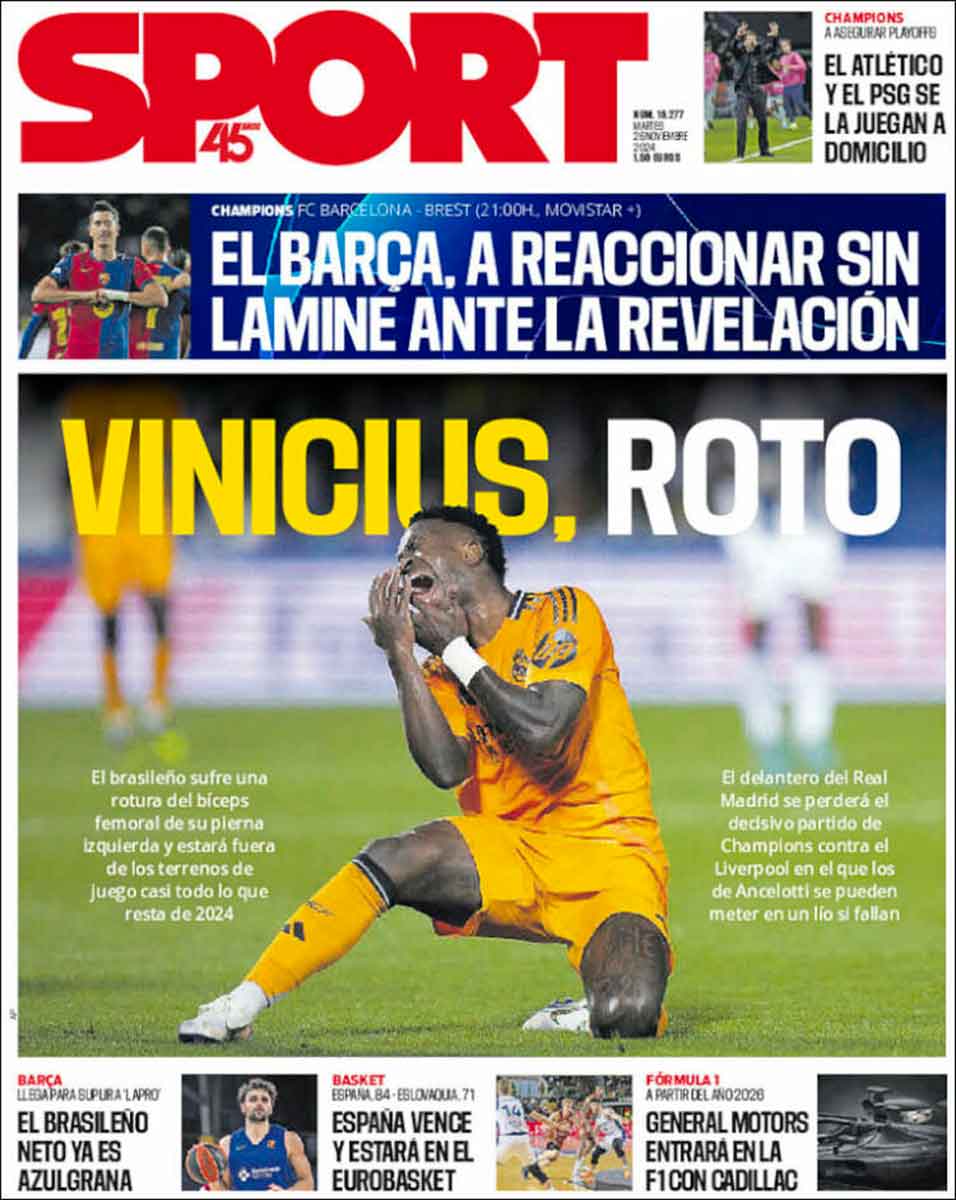 Marca muestra un divertido contraste con Sport. El periódico presuntamente madridista le da un mínimo destacado en negro a la desgracia de Vini, mientras el medio barcelonista lo nombra noticia del día. ¿Será que Marca no quiere enfatizar la precaria situación blanca en cuanto a lesiones, para restar atenuantes a una posible derrota de los compañeros de Vini, posibilitando que de este modo arda (nada que ver con Güler) Troya?