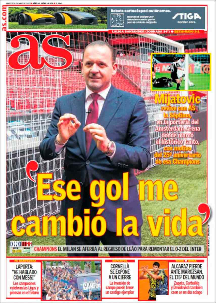 Agradecemos a Marca que dé importancia al fútbol de verdad, el que se verá sobre el césped del Etihad y que enfrentará a Manchester City y Real Madrid por una plaza en la final de la Copa de Europa. Pero lamentablemente Marca no publica esta portada por tal motivo, al menos no es la causa principal que les impulsa a hacerlo, que no es otra que no hablar del Negreirato, de los delitos del Fútbol Club Barcelona, de la Liga cadáver corrompida y sin valor que acaba de apuntarse este club podre con la connivencia de todos los estamentos implicados, incluido el Gobierno de la nación vía CSD.