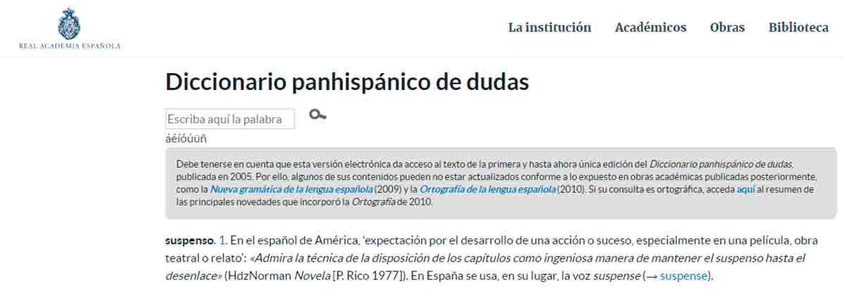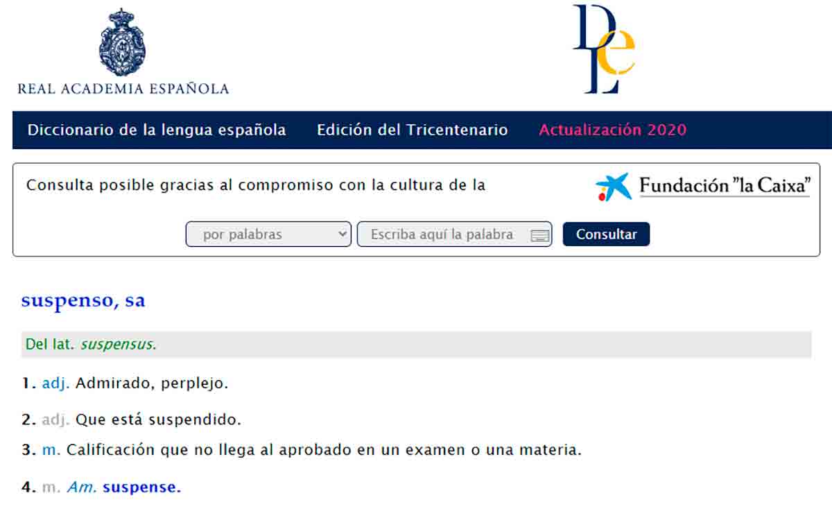 «Suspenso. 1. En el español de América, ‘expectación por el desarrollo de una acción o suceso, especialmente en una película, obra teatral o relato’».