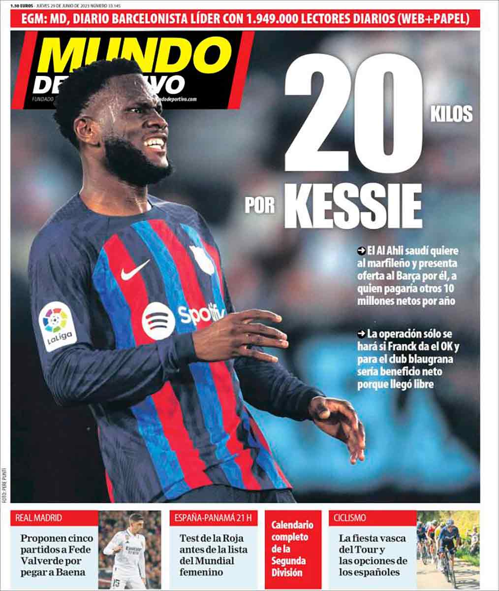 Mundo Deportivo habla de los kilos de Kessié y dedica un espacio —al igual que el resto de diarios— a la propuesta de sanción de cinco partido a Valverde por su trifulca con Baena.
