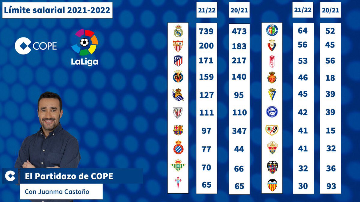 El limite salarial, afecta a nuevas contrataciones (que el barsa solo puede hacer por la regla 4 a 1 es decir por cada 4 euros que libere de masa salarial puede fichar por 1), a los renovaciones que no se si va a regla 2 a 1 o 4 a 1 , y al limite salarial del año proximo. No hay descenso por este tema.