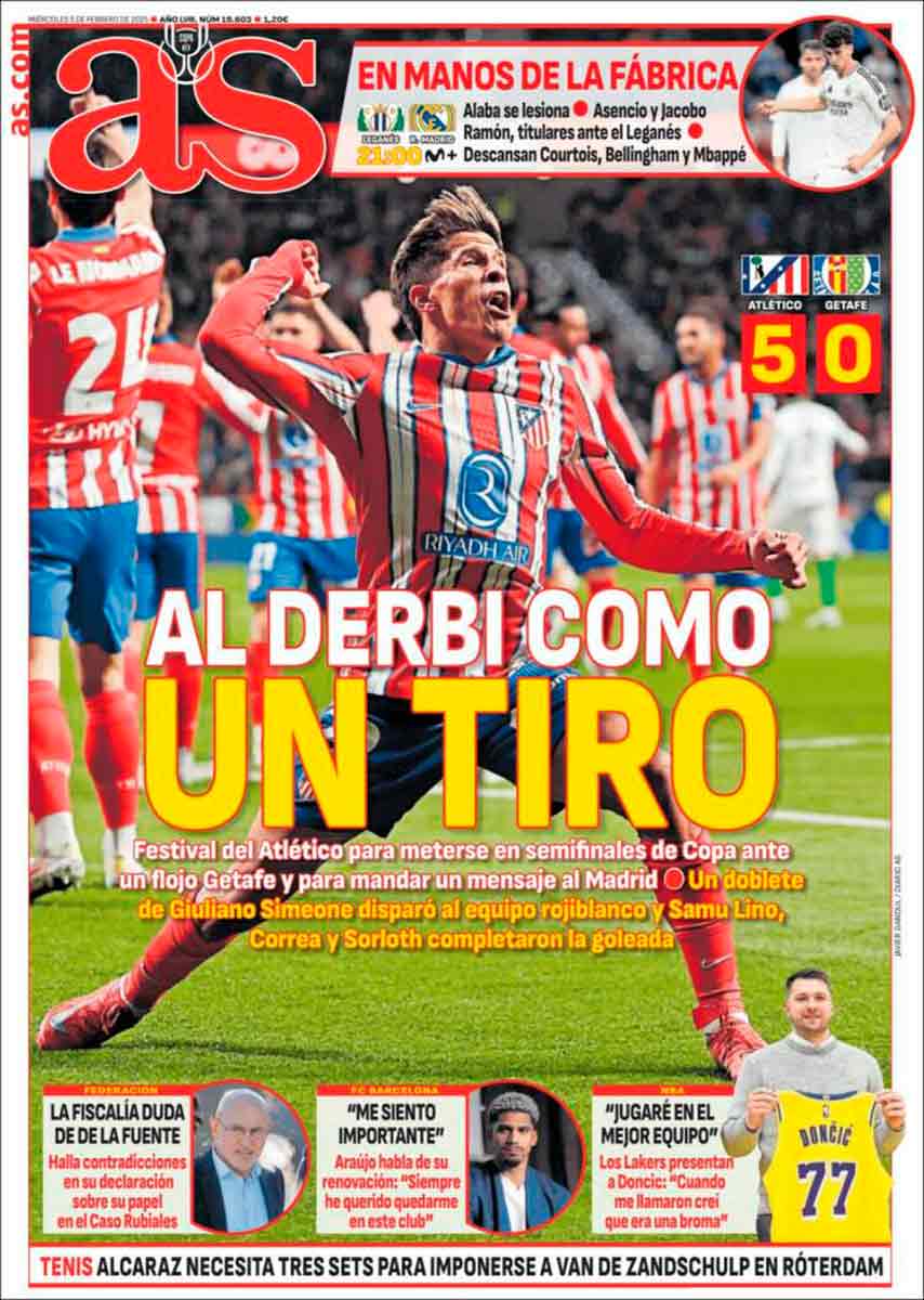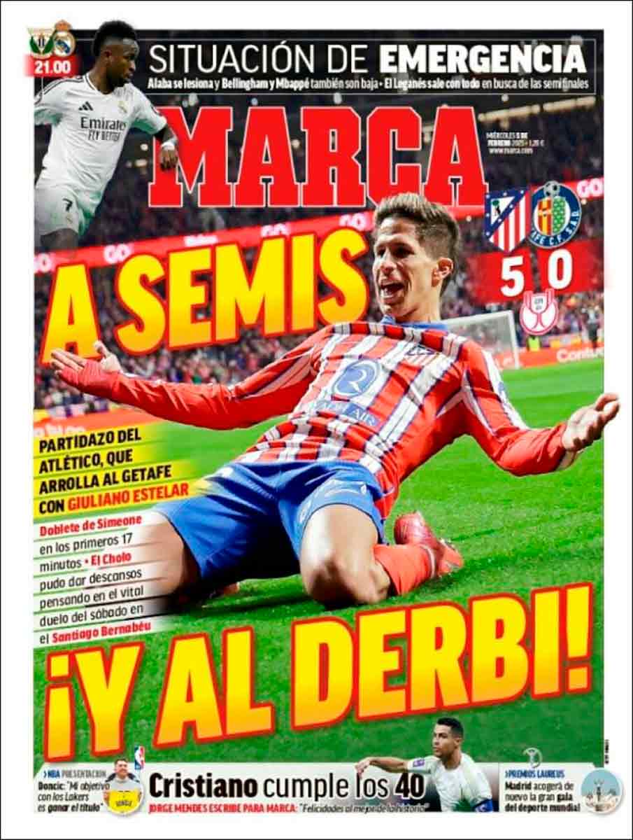 Como un tiro a semis y al derbi. Según indica Marca en su portada, el Cholo pudo dar descansos pensando en el vital duelo del sábado en el Santiago Bernabéu. Porque hay que recordar que además de contar con un árbitro de cámara como Cuadra Fernández, el Atleti disfrutará de un día más de recuperación de cara al choque del fin de semana contra el Madrid. Lo mismo desde hace cien años.