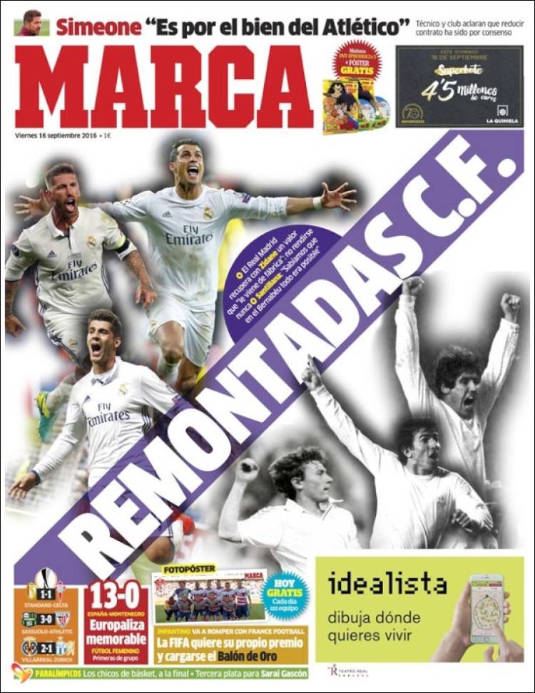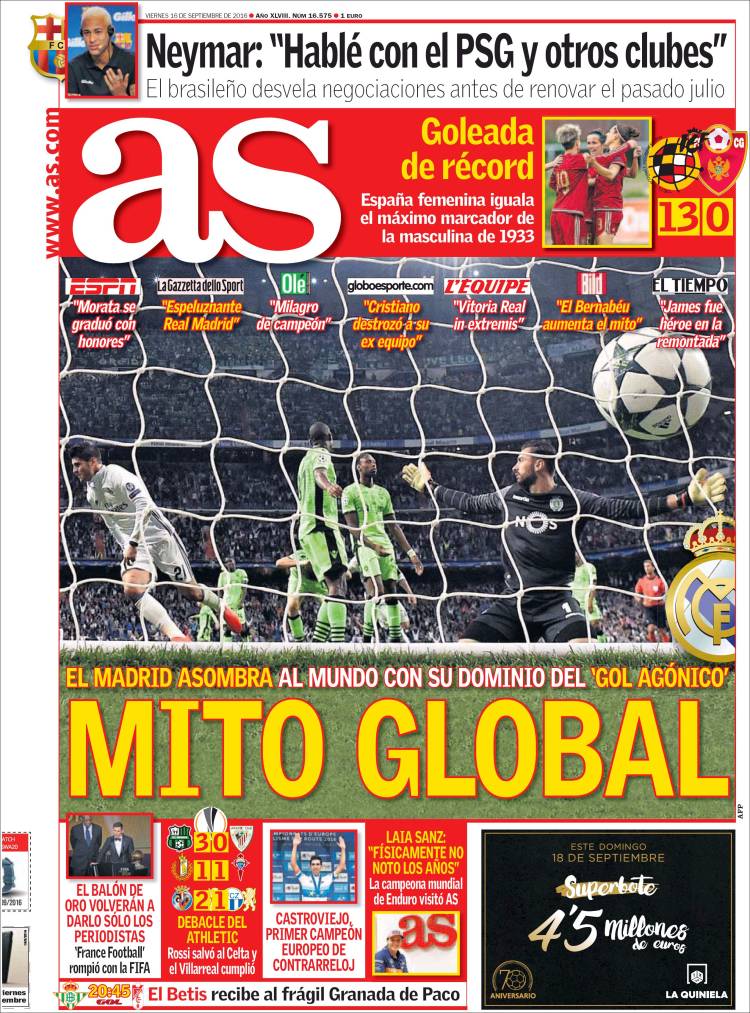 En Ouija Today, sin ir más lejos, destacan la reacción de la prensa mundial a esta sana costumbre del Real Madrid de destrozar crónicas. “Mito global”, se puede leer. Uno se para a reflexionar y se da cuenta que en el planeta sí saben lo que es el club blanco y su historia por mucho que desde España se la vendan de otra manera. Es tan fácil como ver fútbol y no dejar que otros te lo cuenten. El oscuro spoiler del entorno madridista ya no convence fuera de la Península Ibérica. Bueno, en Argentina quizá sí, pero porque Leo Messi lleva más goles que Di Stefano, Gabriel Heinze, Cecilia Roth y el resto de argentinos que en el mundo han sido.