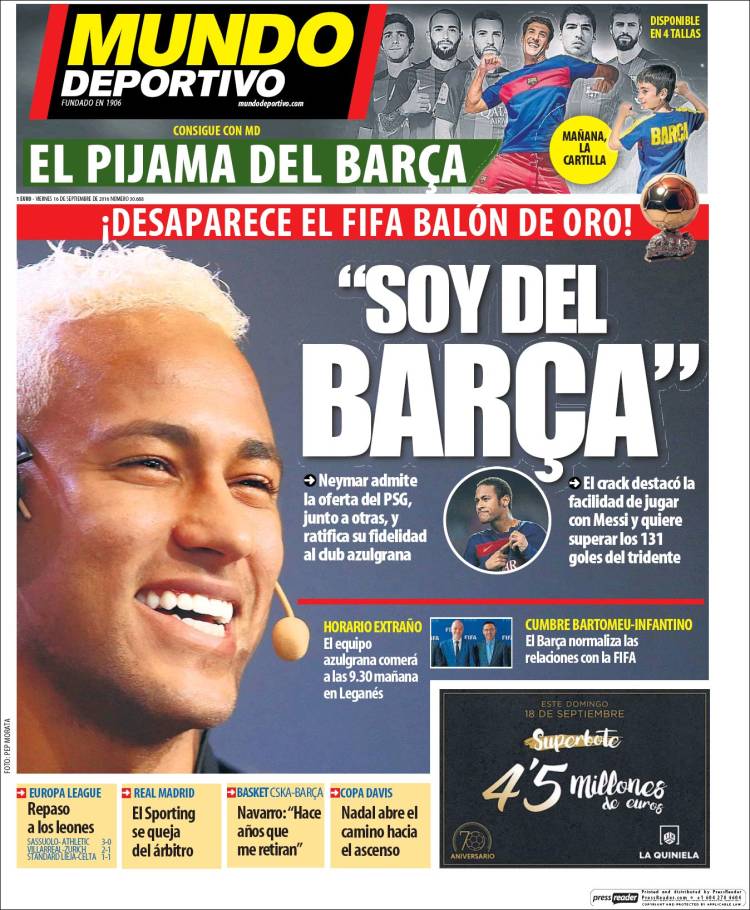 Para acabar y que todos ustedes pongan rumbo al último fin de semana con tiempo estable y chaqueta colgada en el brazo en lugar de puesta, tenemos a Mundo Deportivo, que lleva en su portada a ese rubio platino otrora llamado Neymar. “Soy del Barça”, afirma el brasileño. Y en declaraciones que no vienen en portada porque no debes dejar que una verdad te estropee un buen titular: “Negocié con otros clubes”. Porque, evidentemente, cuando uno es de un equipo y se siente identificado con él, la mejor manera de demostrarlo es cogiendo el teléfono ante la llamada de otros o incluso, por qué no, llamando tú. Que yo soy de aquí, pero si me llaman de allí y me ofrecen más, lo mismo soy de allí. Lo que nos ha llamado la atención es ese titular blanco sobre fondo rojo que exclama: “¡Desaparece el FIFA Balón de Oro!”. ¿Y qué va a pasar entonces con las hilarantes campañas nacidas en la Ciudad Condal? ¡No nos asusten, por favor!