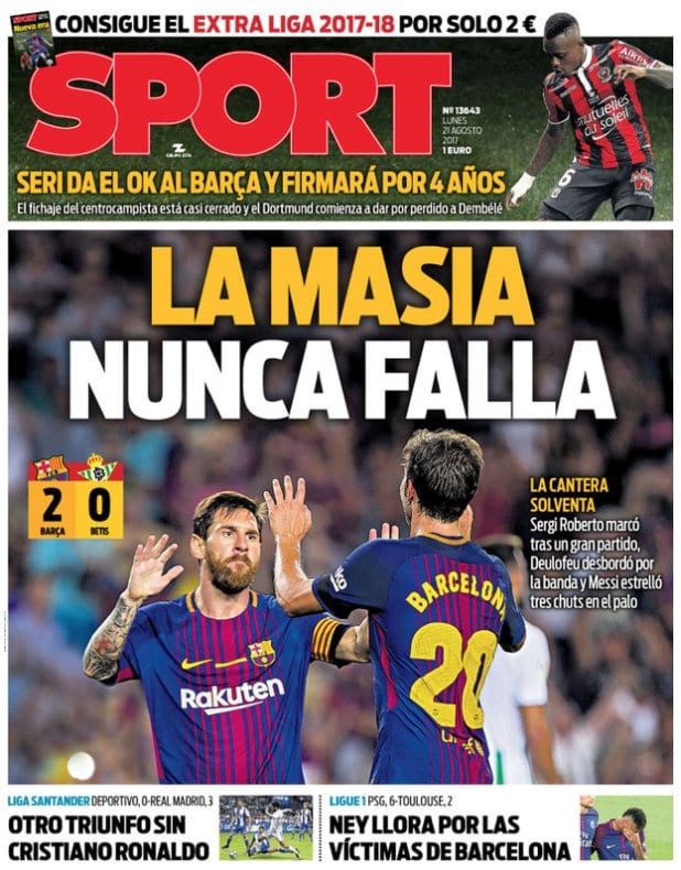 Porque en España el que no se consuela es porque no quiere y el que no se ilusiona es porque es un amargado. Anda que no hay motivos, y más en Can Barça, el planeta de la esperanza infinita. Resulta que ante el Betis acabaron el encuentro cuatro canteranos: Busquets, Denis Suárez, Messi y Sergi Roberto. Suficiente para que el regreso de la Masía suene como un eco infinito. Una nueva época dorada se cierne sobre un Camp Nou necesitado de mimos tras el adiós de Neymar. El brasileño, por cierto, la está rompiendo en París.