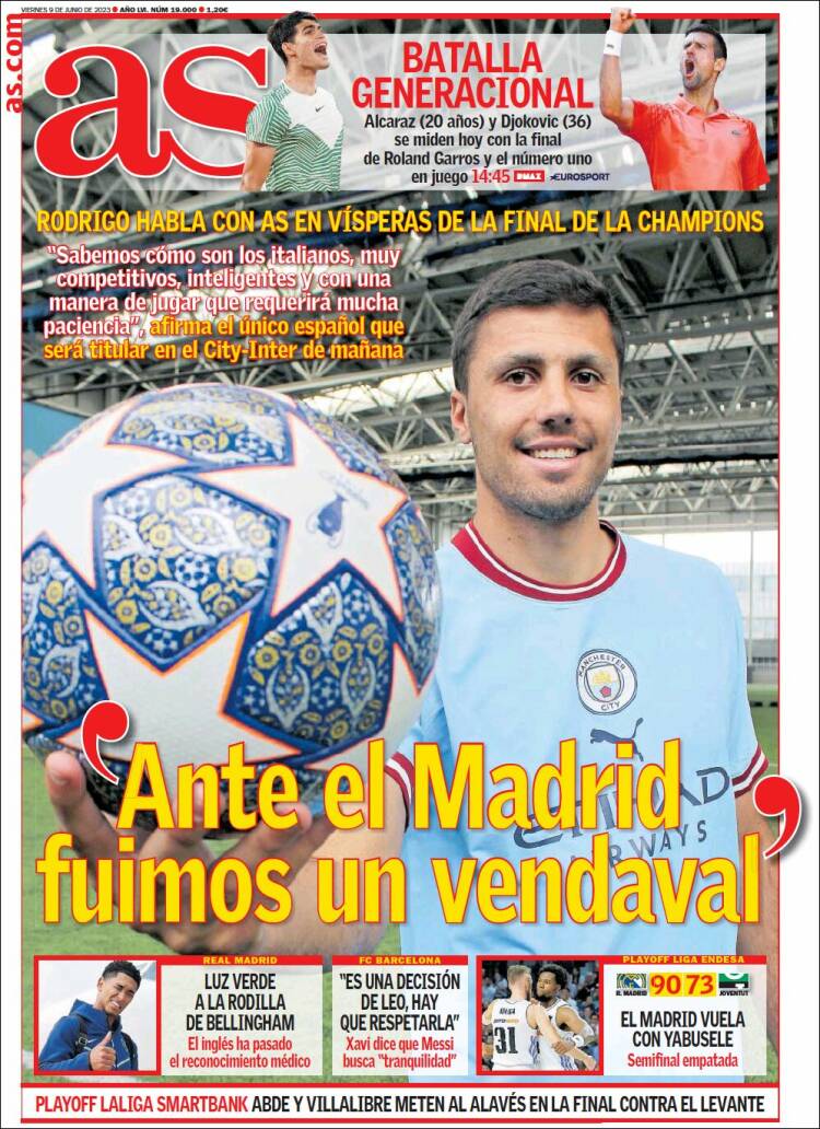 As aprovecha la llegada de eso que nadie sabe lo que es para entrevistar a un jugador que todo el mundo sabe quién es (Rodri, el excelente mediocentro del Manchester City) a cuenta de algo que todo el mundo sabe qué fue. “Ante el Madrid fuimos un vendaval”, nos recuerda gentilmente el centrocampista. Gracias, estimado Rodri, por recordárnoslo. Gracias, estimado As, exponente indudable de la ominosa Central Lechera, por meter el dedo en la llaga con esta entrevista.
