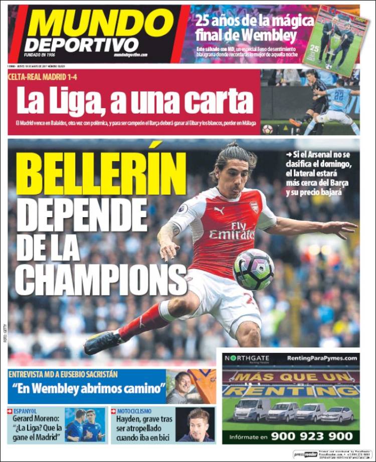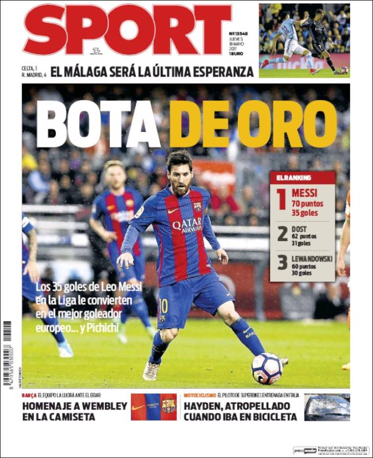 Dado el desolador panorama, nuestros amics de la prensa catalana han optado hoy por tapar sus vergüenzas en sus primeras planas. Allí verán el resultado de Vigo en pequeñito. Oculto tras la enésima portada de Messi y Bellerin, que va camino de ser el nuevo Marquinhos culé de los fichajes estivales y los rumores veraniegos. La situación es desesperada. Tanto, que Sport se permite un impulso lírico de denominar a Málaga como la última esperanza. Curiosa tan sobrevenida admiración por un club cuyo jeque denominó hace unos días como escoria a la prensa deportiva catalana. No a los catalanes como habría de rectificar, sino a su prensa deportiva. Vayan ustedes a saber por qué.