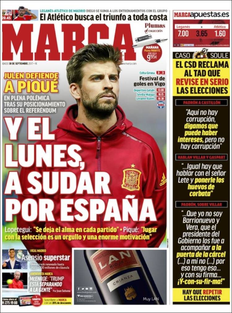 Sería igual el trato que recibiría el impresentable, por ser fino, de Piqué, qué lástima que este energúmeno tenga de segundo apellido el mismo que el del presidente más importante en la historia del Real Madrid C.F., en el supuesto caso, Dios nos libre de que Piqué jugara en el Real Madrid? No arriesgo absolutamente nada si digo que el trato sería muy diferente por parte de la demagoga prensa deportiva editada en papel de este país tan peculiar llamdo España, (todavía aunque no se sepa por cuánto tiempo).... confiaba en que después de la nefasta segunda época del resentido del bigote en la selección española, Julen recuperara la cordura y así poder volver a sentirme orgulloso de mi ex-querida selección... ya veo que no, que vuelve a ser tan liviano con los jugadores de la mafia más grande de la historia del deporte mundial como lo fue el resentido del bigote o como lo ha sido Mariano Rajoy con el 1-0 de los cojones.... así las cosas... aúpà Portugal, si es que consigue clasificarse para el Mundial como es previsible, y ojalá a esta roja dominada por los separatas de farsa le metan 8 en cada partido y se quedaran fuera del mundial en beneficio de Italia.... los madridistas lo íbamos a agradecer mucho con el descanso de jugadores como Sergio Ramos, Nacho, Isco, Asensio, o Carvajal.... al que, ya sabiendo el parte médico emitido por el Real Madrid, aprovecho para desearle una feliz y pronta recuperación de su afección del pericardio, ya que, como a todos los jugadores de la plantilla de este año porque para éso forman parte de ella, le vamos a necesitar en plenas condiciones para renovar los cuatro títulos del año pasado o ganar alguno más si fuera posible.