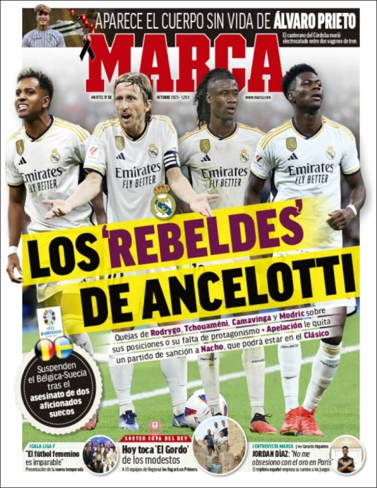 No sólo Marca no habla del BarçaGate, sino que se hace eco de diferentes declaraciones de jugadores de Concha Espina, en medio de la diáspora de sus equipos nacionales, para presentarlos a todos bajo la etiqueta de “rebeldes”. Habría que ver caso por caso, pero la exageración malévola es evidente. Mirad, Marca, ya no es que os pidamos que informéis de lo importante. Hemos arrojado la toalla en eso. Sólo os pedimos que, puestos a no informar de lo importante, no lo sustituyáis por basura infecta destinada a herir al Madrid, que es, precisamente, la principal víctima de eso tan importante que ignoráis.