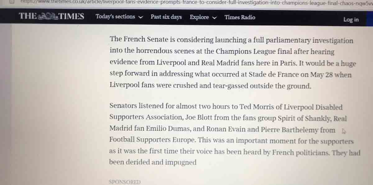 Nuestro Emilio Dumas, nuestro querido Athos, socio y colaborador de La Galerna, intervino ayer telemáticamente en el senado francés para explicar su versión de los hechos. Emilio es francoespañol, además de socio del Madrid y asistente al evento. Nos satisface enormemente que un madridista de a pie (pero vaya madridista) como Emilio fuese quien contase a sus señorías, en primerísima persona, el grado de descontrol, caos y vejación que sufrieron en los alrededores del estadio parisino (¡e incluso en su interior, donde se produjeron atracos!) tanto los hinchas madridistas como los británicos, injustamente acusados estos últimos del desastre por parte de alguna autoridad francesa.