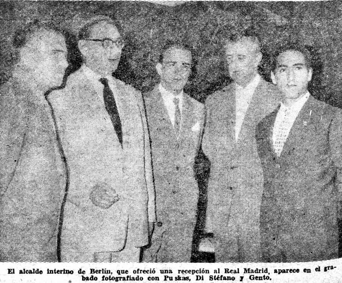 Al día siguiente la expedición llegó a Berlín para el partido que tenía concertado el 16 de agosto ante un combinado berlinés en el Olympiastadion. Dicha selección estaba integrada por jugadores de dos equipos capitalinos: el Hertha y el Viktoria 1889. Los homenajes continuaron y el día 15 se celebró una visita oficial al ayuntamiento de Berlín Oeste donde el alcalde interino, Franz Amrehn (en sustitución del ausente Willy Brandt), recibió a los madridistas. A la cita acudieron multitud de fotógrafos y también la televisión alemana que filmó el evento y entrevistó a Ferenc Puskas, que estaba acompañado del mito teutón Helmut Rahn, antiguo rival del húngaro en la final del Mundial de Suiza’54, catalogada como ‘El milagro de Berna’ tras el triunfo de los alemanes.