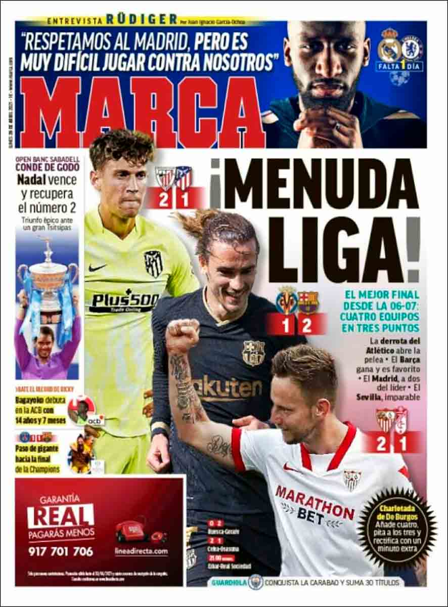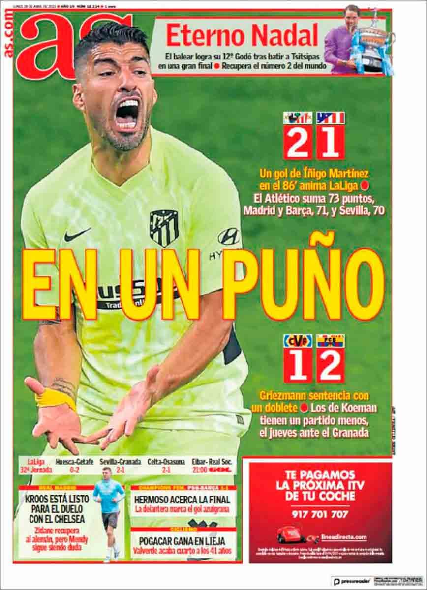 La prensa deportiva madrileña se felicita por lo apretada que está la competición doméstica, aunque felicitarse por cualquier cosa con el careto de Luis Suárez es capaz de reventar la fiesta más glamourosa y hedonista. Tanto Marca como As ofrecen un resquicio para que vayamos abriendo boca (no tanto como Suárez) de cara a lo que de verdad nos interesa, aquello que ha hecho inmenso a nuestro club y puede volver a coronarlo en lo más alto en cuestión de un mes, aquello capaz de convertir los malos tragos de Messi, Suárez, Emery y los Hernández al cuadrado en menudencias que uno deja atrás con un recuerdo displicente y una sonrisa extasiada. Nos referimos, sí, al partido de mañana contra el Chelsea, nada menos que una semifinal de Champions League que (por si la Orejona, que no los necesita, precisara de alicientes extra) podemos ganar a la organización corrupta que la monta, y que ha manifestado con insultos y amenazas su odio al Madrid por haber cometido el delito de buscar una salida a medio plazo al carcomido negocio del fútbol.