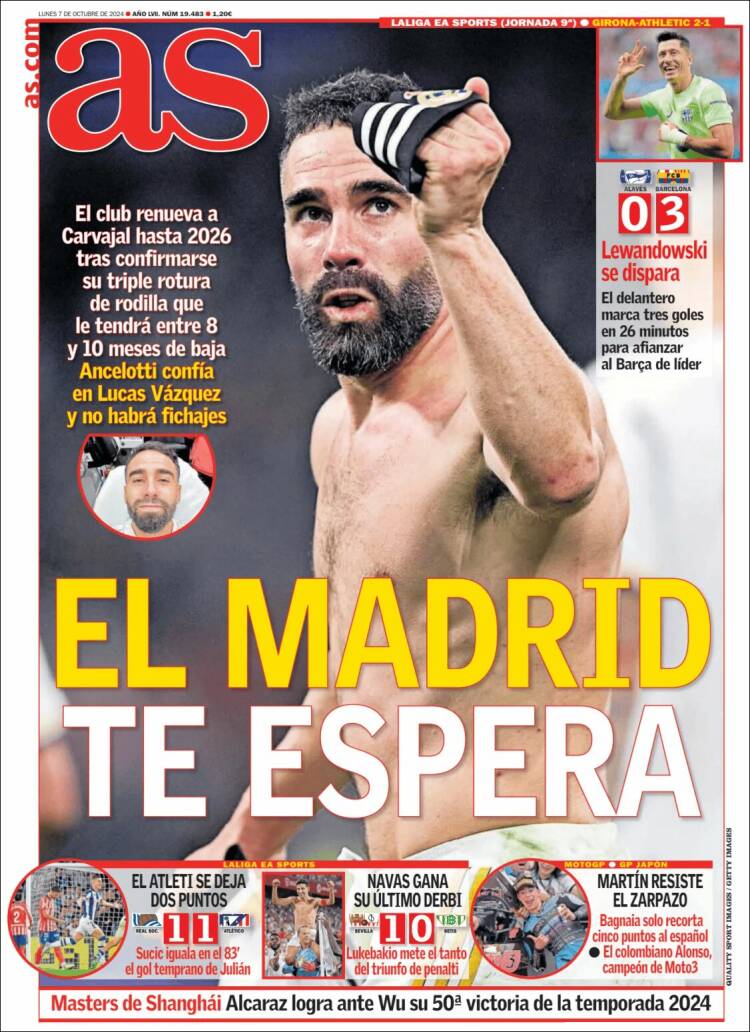"El Madrid te espera", titula As, y nos parece un buen modo de sintetizar lo que representa la renovación del contrato de Dani. El Madrid hace gala de gratitud y rubrica en negro sobre blanco su fe en la recuperación de Dani, así como la necesaria reciprocidad tras tantos años de admirable compromiso por parte de uno de los mejores exponentes de su historia gloriosa. Seis Champions contemplan a Carvajal, que ha anunciado que volverá "como una bestia". Quien tiene el corazón de una bestia puede anunciar cualquier hazaña sin que la esperanza se resienta. Te creemos, Dani.