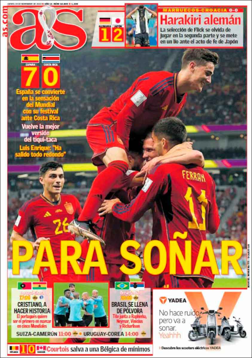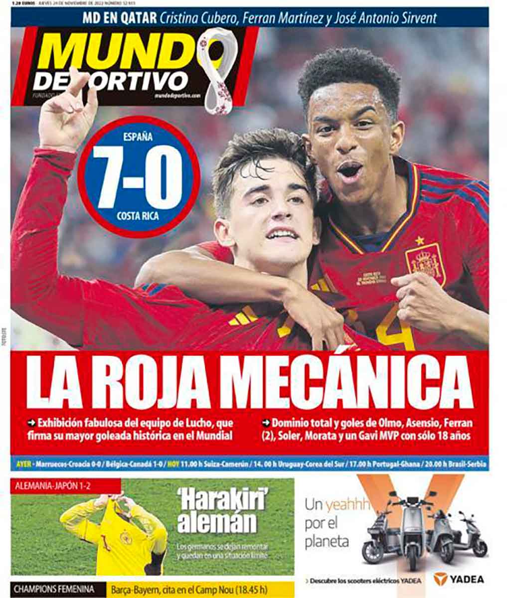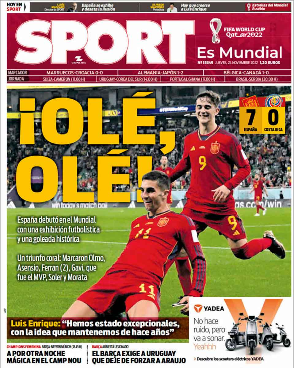 Buenos días. La llamada Roja ganó 7-0 a Costa Rica. No nos oponemos. Nos habríamos opuesto menos todavía si lo hubiera hecho en otro mundial distinto a este. Las portadas del día lo celebran como si la goleada hubiera acontecido en un mundial digno, por un lado, y como si el rival hubiese sido muy potente, por el otro. La primera plana de Sport incluso viene con la flamenca y el toro colocados encima cual televisión catódica del S. XX.