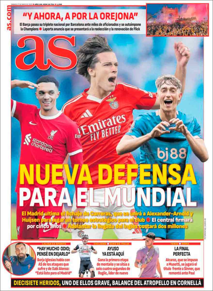 El diario As se centra en los previsibles fichajes del Real Madrid para la defensa. Dos que parecen ya cerrados, Alexander-Arnold y Huijsen, y un tercero, Álvaro Carreras, que sigue en negociaciones. O no, porque son tantos los nombres que han llevado los medios a las portadas en los últimos ejercicios que darían para confeccionar tres o cuatro plantillas completas. Conocemos de sobra este período de entreguerras: surgirán muchos nombres en las próximas semanas, algunos inverosímiles,  y por ello, haremos bien en atender solo a los comunicados oficiales, por mucho que la política de comunicación del club nos haya resultado incomprensible durante mucho tiempo.