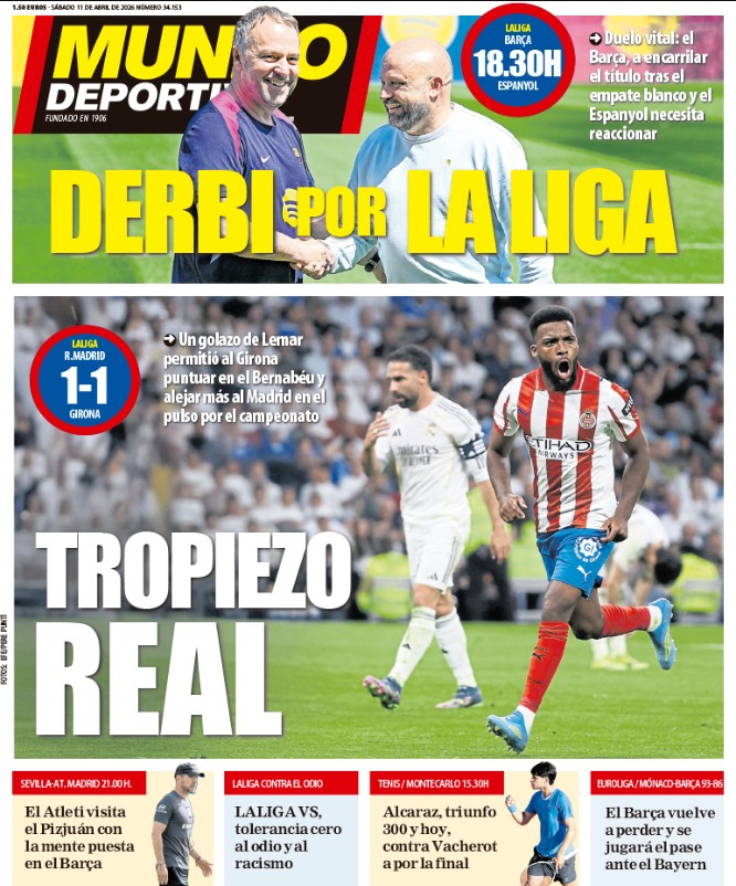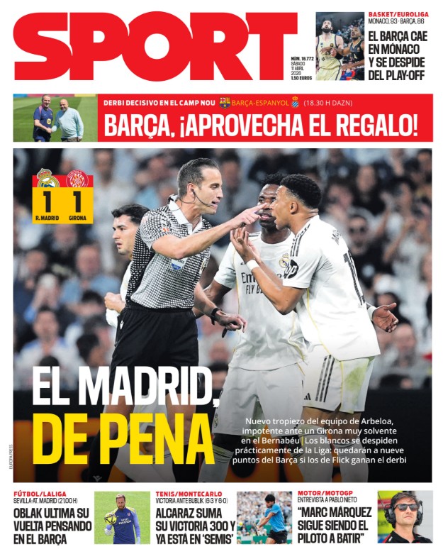 Sport va más allá y califica como "de pena" al Real Madrid. Por supuesto, ni Sport ni Mundo Deportivo mencionan la escandalosa jugada, hacia el final del partido del Bernabéu, en la que Mbappé fue agredido en el área gironesa y, pese a sangrar abundantemente, ni Arberola Rojas pitó penalti ni le reconvino su compinche en el VAR (el inefable Trujillo Suárez) ni se ofreció la escena al espectador, censurándose la sangre de un Mbappé malherido sobre el césped del Bernabeú. La sangre de Mbappé no existe.