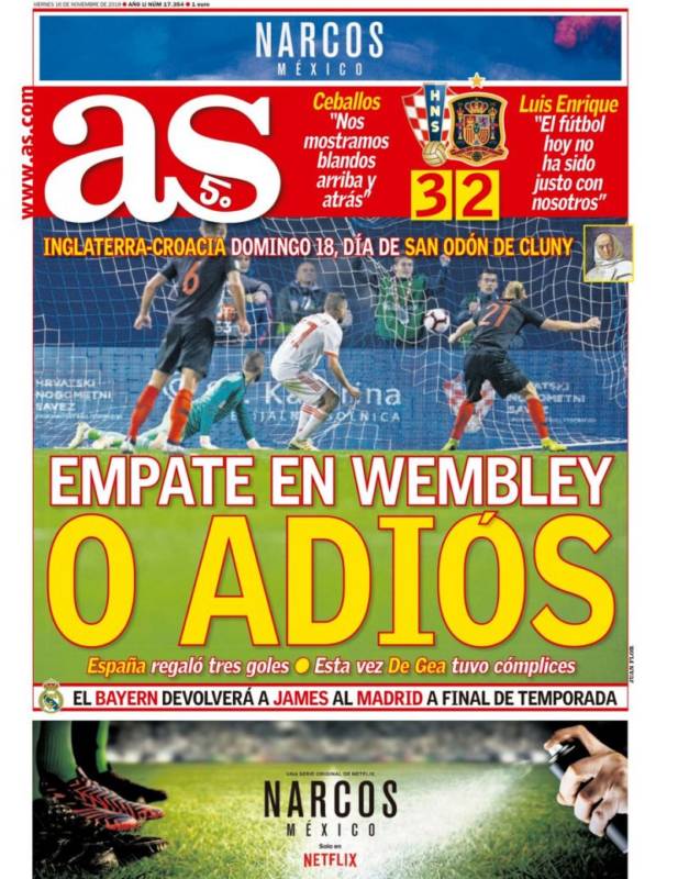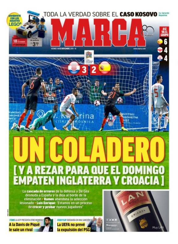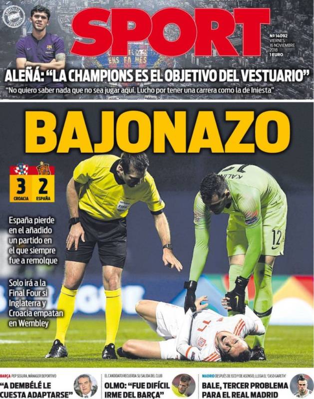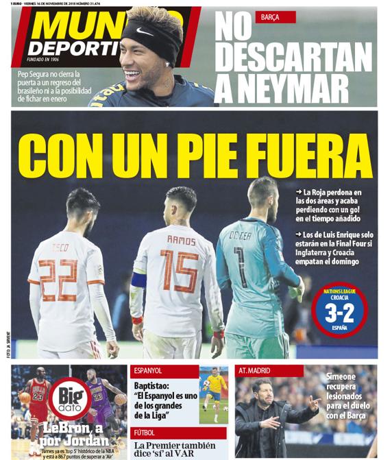 Buenos días. Jornada complicada en la prensa deportiva española. La selección perdió 3-2 en Croacia y las opciones para jugar la 'Final Four' de la 'UEFA Nations League' se reducen a rezar para que los croatas empaten en Wembley el domingo. No vale otro resultado. El mal estudiante, a la espera de que el profesor convierta el cuatro y pico en un cinco. No tiene buena pinta.