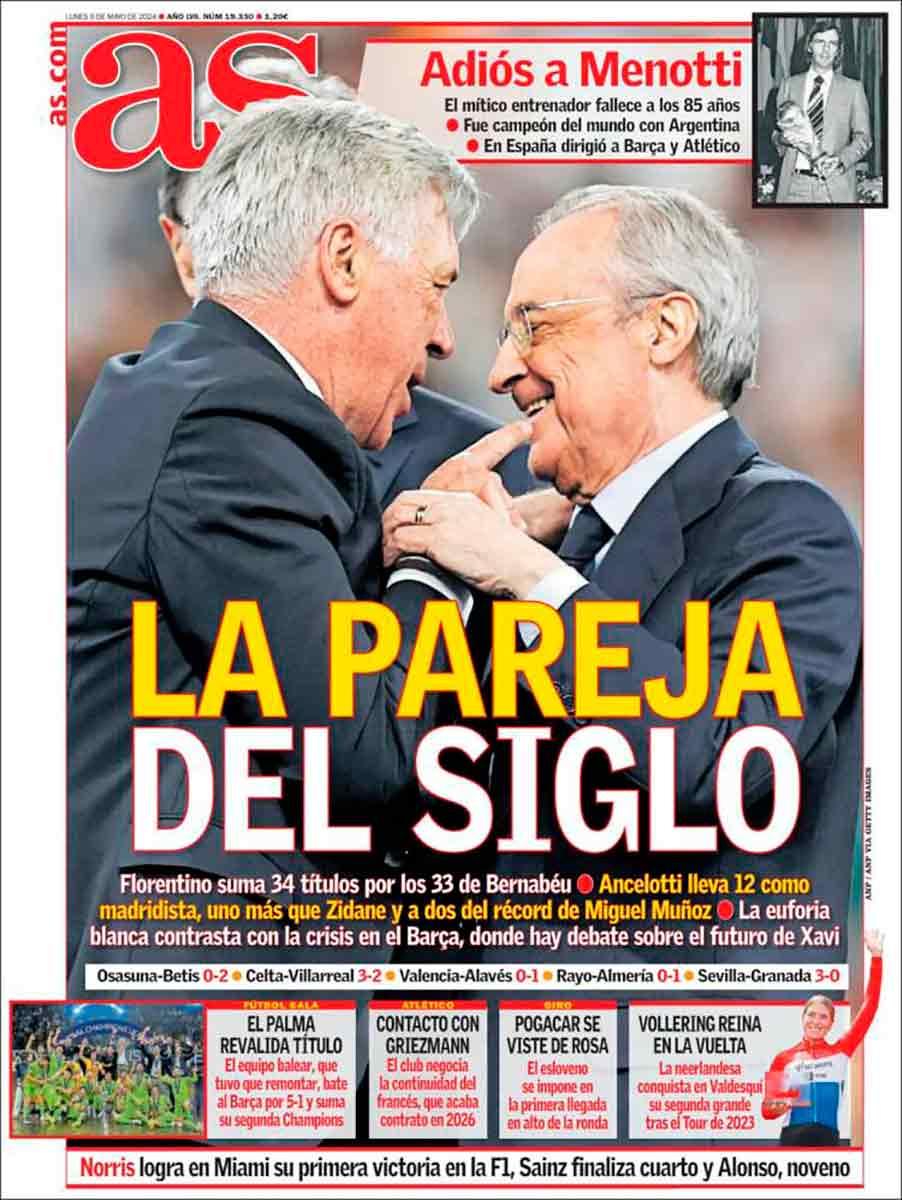 “La pareja del siglo”, titula el diario madrileño con una cariñosa imagen de Florentino Pérez y Carlo Ancelotti. Al igual que Marca, sustentan el titular apoyándose en lo irrefutable de las matemáticas: “Florentino suma 34 títulos por los 33 de Bernabéu. Ancelotti lleva 12 como madridista, uno más que Zidane y a dos del récord de Miguel Muñoz”. No está nada mal para un presidente sin dirección deportiva y para un técnico que no es sino un mero gestor.