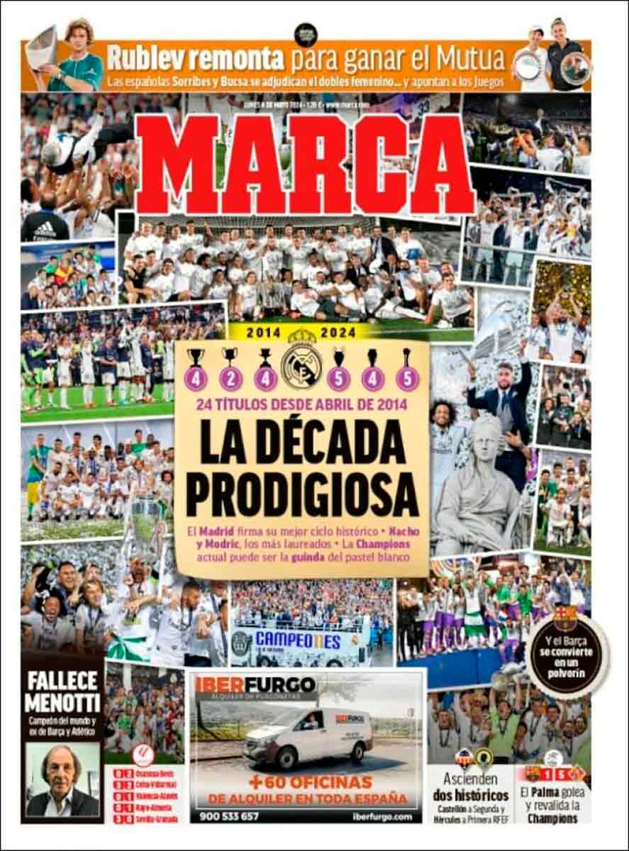 Ni siquiera Marca, tan cicatero con el Madrid dados sus intereses, evita decir una verdad, incómoda para muchos, avalada por los malditos números: la última década blanca ha sido la más prolífica en títulos de su historia, 24 desde abril de 2014. “La década prodigiosa”, titulan, sobre un collage de fotografías de la celebración de varios de esos trofeos.