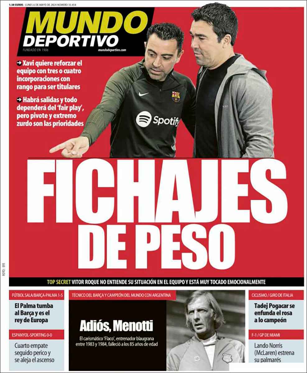 Hay una triste noticia que aparece en todas las portadas y es el asunto principal de la de Sport, el fallecimiento de César Luis Menotti, entrenador argentino campeón del mundo que en España dirigió a Barça y Atlético. Lamentamos su muerte y enviamos nuestras condolencias a familiares y seres queridos.