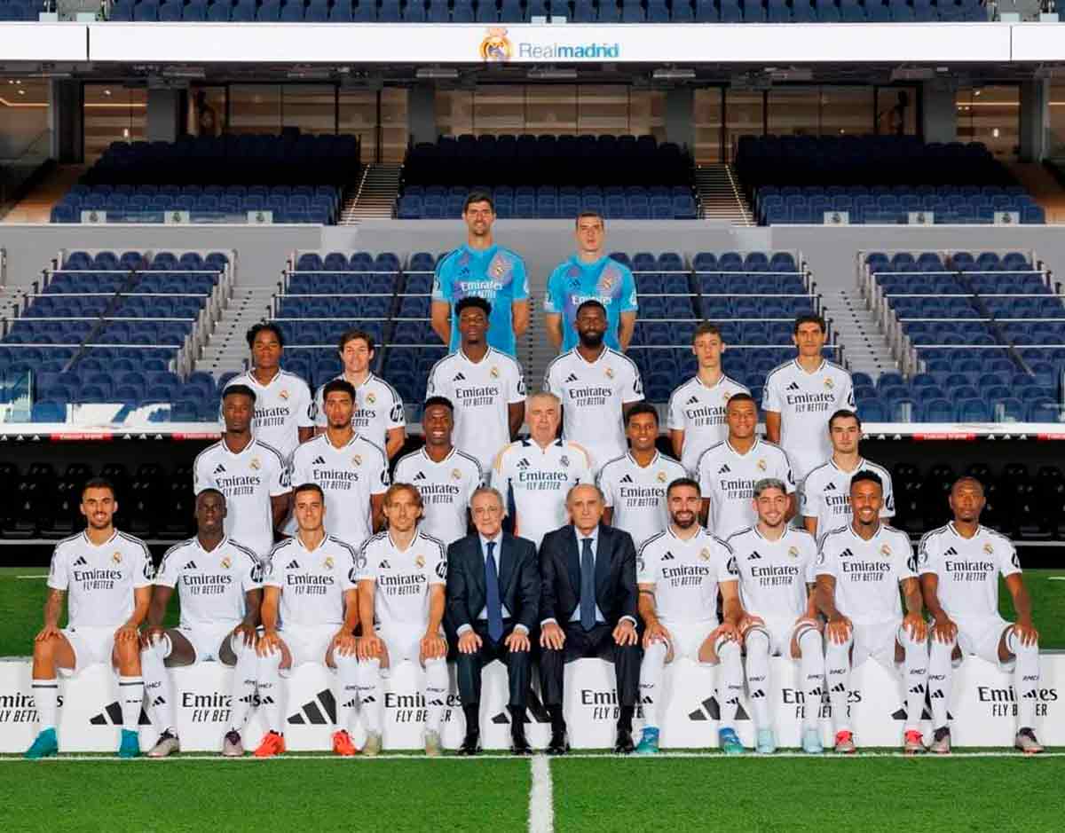 Pongámosla de nuevo. Por qué no. Miren la foto. Modric, Kroos, Nacho, Carvajal, Gento. Miren los escudos. Seis, seis, seis, seis, seis.