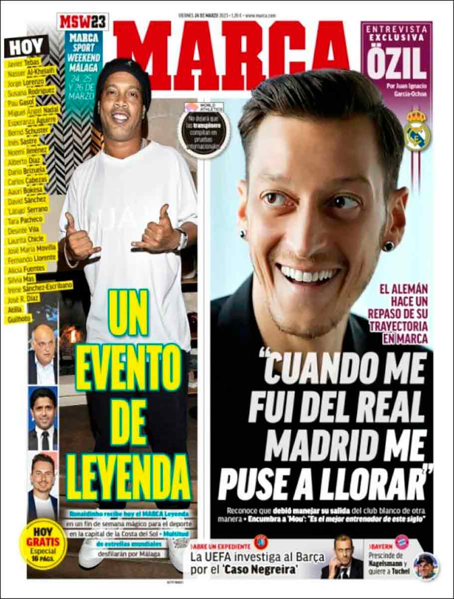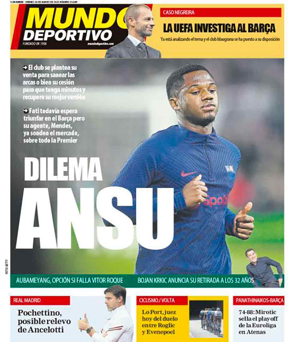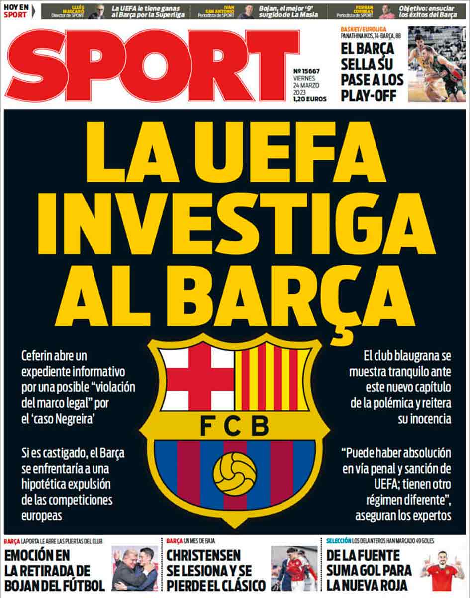 La novedad más llamativa de ayer es que la UEFA investiga al Barça. Y curiosamente la portada que mejor refleja la noticia es la de Sport, que no recurre —en sus letras gordas— al manido sintagma “Caso Negreira”, como hacen As y Marca. Mundo Deportivo se alinea con Sport, pero en pequeñito.
