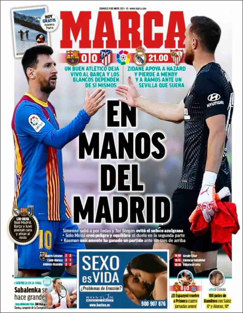 “En blanco” es más genérico que “en manos del Madrid”, y puede servir para hacer referencia tanto a los madridistas como a los sevillistas, si bien en el subtítulo indican eso que tan pocas veces se ha cumplido esta temporada de “depender de sí mismo para ganar la Liga”. Hasta ayer mismo el Atleti dependía “de sí mismo para ganar la Liga” y volverá a hacerlo esta noche si el Real Madrid no se alza con la victoria, así que llamemos de nuevo a la prudencia y por una vez juguemos a cholistas y vayamos “partido a partido”.