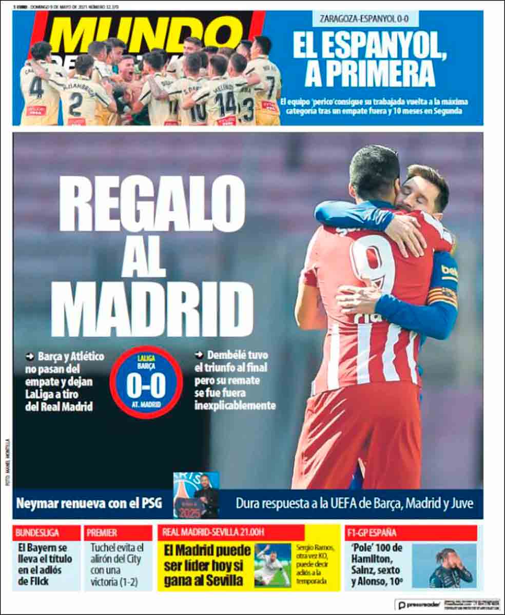 Donde no hubo sorpresas fue en Segunda División y todas las portadas recogen la vuelta del Real Club Deportivo Espanyol a la Primera. Desde aquí nos alegramos enormemente por la vuelta de ese equipo hermano, una especie de reducto madridista en territorio hostil. El Espanyol es equipo de Primera, de donde nunca debió salir, y al igual que las cuatro veces anteriores en que perdió la categoría ha necesitado una sola temporada para recuperar el lugar que nunca debió abandonar. En Sarriá, en Montjuic, en Cornellá, o en cualquier lugar en el que pueda incomodar a Gerard Piqué.