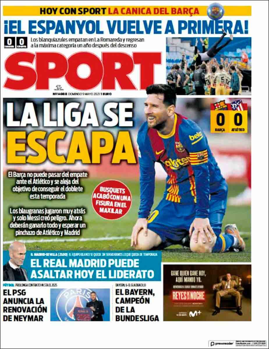 “La Liga se escapa” es un titular que firmaría el mismísimo Carlos Martínez acompañada del pronombre personal “nos”. El diario Sport utiliza la misma foto que el As y no nos queda ninguna duda: Messi estreñido. Perdón, ESTÁ-REÑIDO con el gol ante los tres rivales por el título, aunque por el gesto y si se amplía un poco la foto… esa mueca contrariada… dudamos acerca de lo primero. Los que no dan sorpresas son los artistas de la prensa cataculé a la hora de referirse a los nuestros: “El Real Madrid puede asaltar hoy el liderato”. Los verbos no son casuales y te sueltan “asaltar” en el sentido indicado por la RAE como “ataque realizado a una persona o lugar con el propósito de robar”. Váyanse a esparragar, señores.