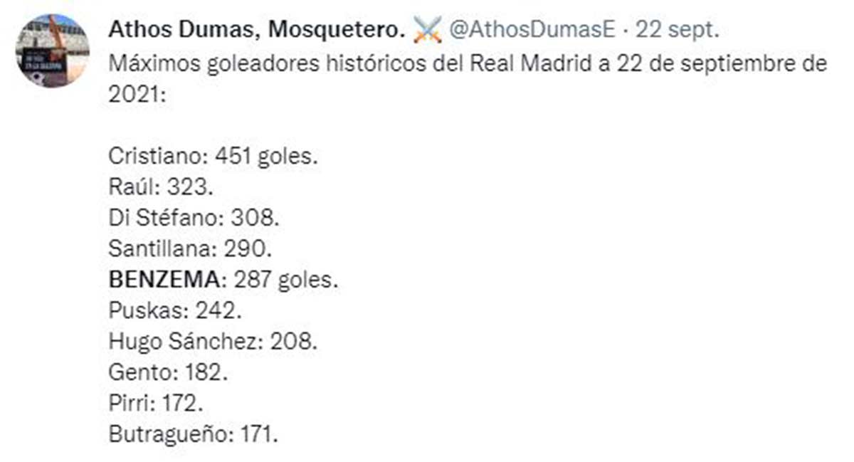 Lo cierto es que en la foto con que nos “obsequian” tanto la mueca como el gesto con las manos resultan feos de narices, más propios de un jovenzuelo en la discoteca a las cinco de la mañana apuntando a una moza de buen ver que de nuestro capitán, figura y por qué no decirlo, aspirante a ese engendro de votos opacos que es el Balón de Oro. Y a Karim lo queremos mucho y no podemos afearle nada después de tantos años de satisfacciones, así que nos limitaremos a aplaudir que siga dándonos alegrías “200 goles después”. Suponemos que se refieren a LaLiga, puesto que la magnitud de la cifra de Karim Benzema va mucho más allá, tanto, que está a punto de superar al mítico Carlos Santillana en la clasificación de goleadores históricos del club: