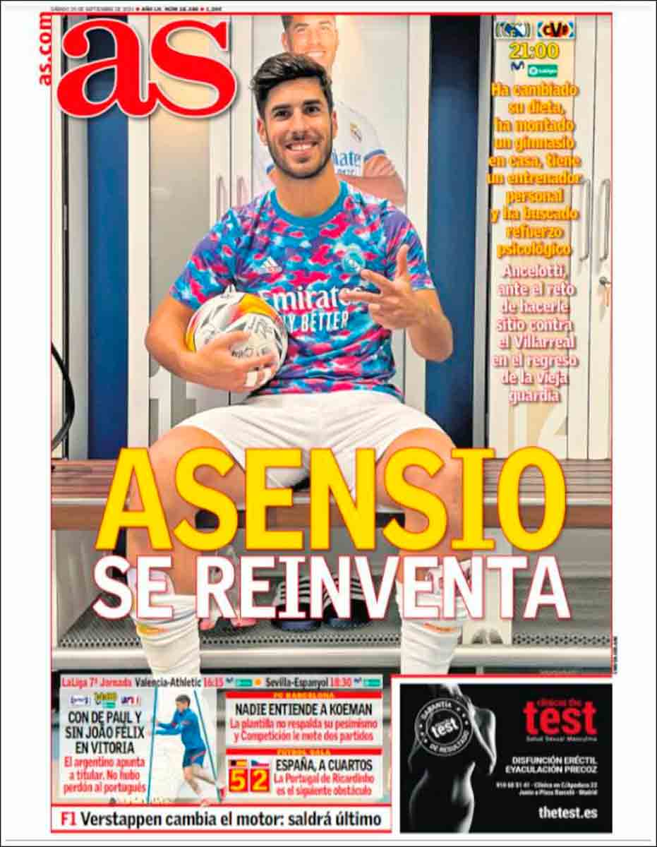 Hace un par de días nos hablaba Ramón Álvarez de Mon del disgusto de Marco Asensio por su escasez de minutos con Ancelotti y hoy aparece en portada como si reivindicara más presencia en el equipo. Ojo, no decimos que lo reivindique el jugador (pese a que haya cambiado de dieta, gimnasio, psicólogo, entrenador y quien sabe si abandonado el Lexatin antes de los partidos), sino el propio periódico, porque ya sabemos que estos medios son tan dados a elevar a los altares a los jugadores españoles como a cebarse con los foráneos. Las buenas noticias en el Madrid son negativas para la prensa, como se puede leer en el párrafo que acompaña la foto de Marco: