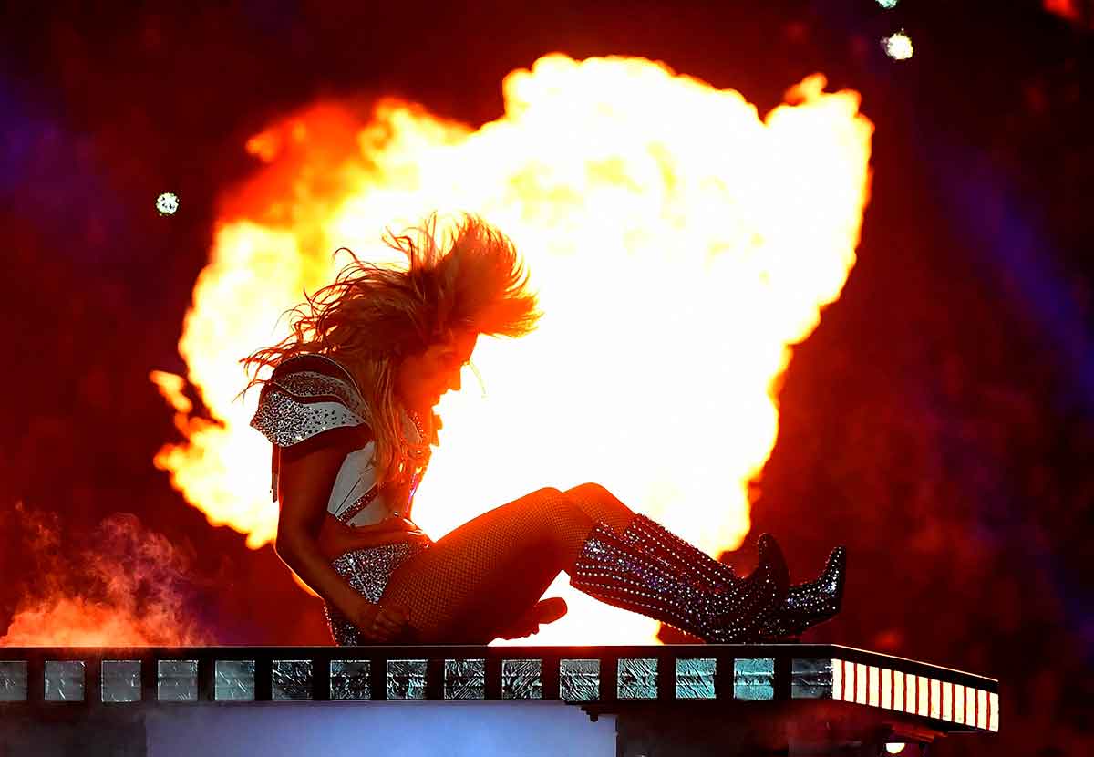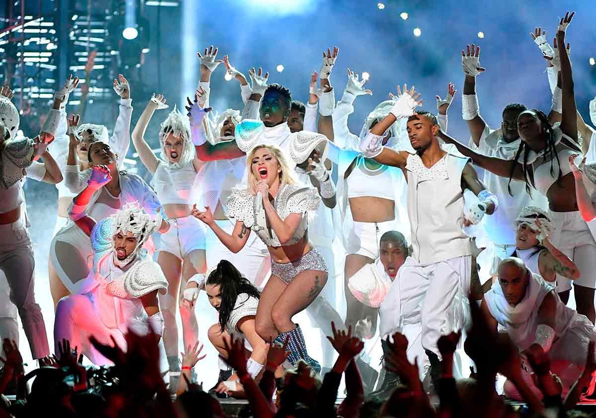 La música se para de golpe con un sonido de tambor eléctrico. Lady Gaga está de pie con las piernas abiertas, la cabeza baja y la melena colgante. Se escucha un latido cada vez más rápido. El Bernabéu enmudecido y brillante. Lady Gaga levanta lentamente el rostro. Parece hallarse en trance.