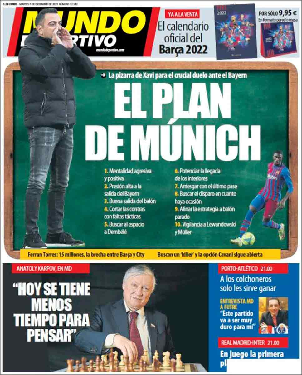 Las portadas de MD y Sport no saben que mas decir para crearles a sus seguidores ilusiones de una victoria de los dirigidos por Xavi. Lo de la pizarra es una oda a lo ridiculamente obvio, propio de lo que su entrenador y su entorno diria como un plan estrategico-revolucionario para ganarle al Bayern. Son un chiste y meme constante.