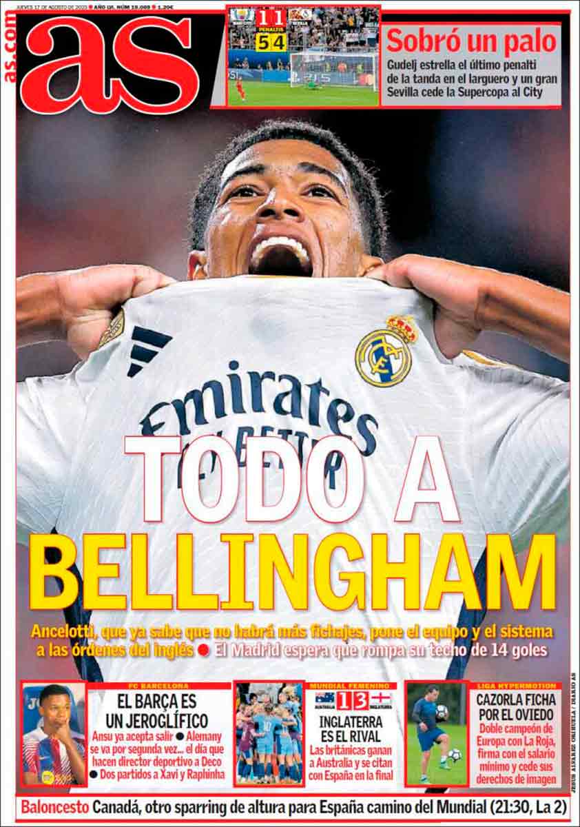 Precisamente Bellingham es protagonista de la portada de As. «Todo a Bellingham» titulan. En As siguen con la idea de que no habrá más fichajes. Parece más cauto no realizar ninguna afirmación categórica hasta que cierre el mercado.