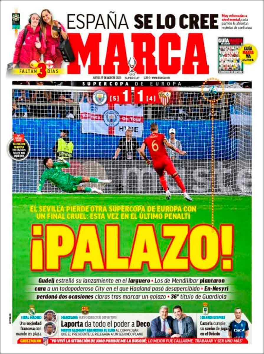 Marca da casi todo el protagonismo al palo que sufrió el Sevilla frente al fútbol de la gente del City, y la zona alta la dedica a la selección española de fútbol, que se enfrentará a Inglaterra en la final del Mundial. Si gana, ya sabéis que todo el mérito será de las 15 jugadoras amotinadas que no están precisamente en un torneo que habrían ganado por wifi, teletrabajando.