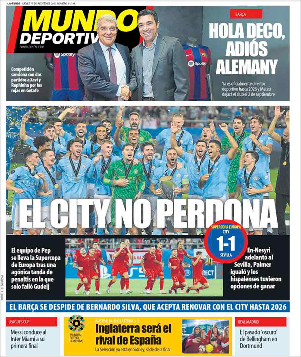 El diario de Godó, grande España, destaca con énfasis la victoria en la Supercopa de Europa del Manchester City, que como todos sabemos es un equipo español y muy español, como diría Mariano, entrenado por un patriota de la talla de Pep. Los clubes-estado suman otro trofeo y borran un poco más la idea de fútbol y de competición deportiva.