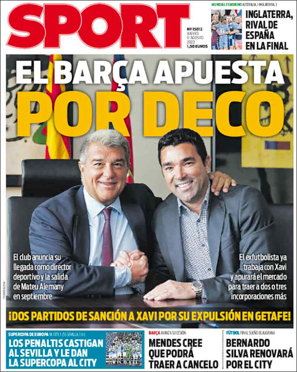 En Sport aparecen los dos lusos. De Mendes dicen que cree que podrá traer a Cancelo y de Deco que apurará el mercado para fichar dos o tres jugadores más. Será por dinero. No tenemos dudas acerca de Deco, cuyas capacidades dejó patentes con el «fichaje» de Arda Güler, publirreportaje incluido del viaje a Turquía.