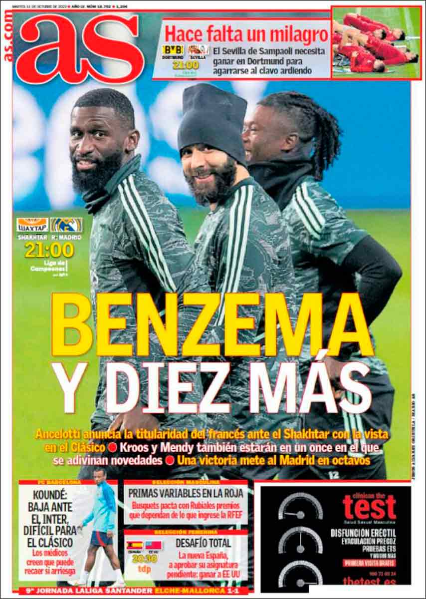 Volvemos a lo nuestro, al Madrid, que esta noche intentará lograr ante el Shakhtar el pase a octavos de la Champions. “Benzema y diez más” es el titular de As.