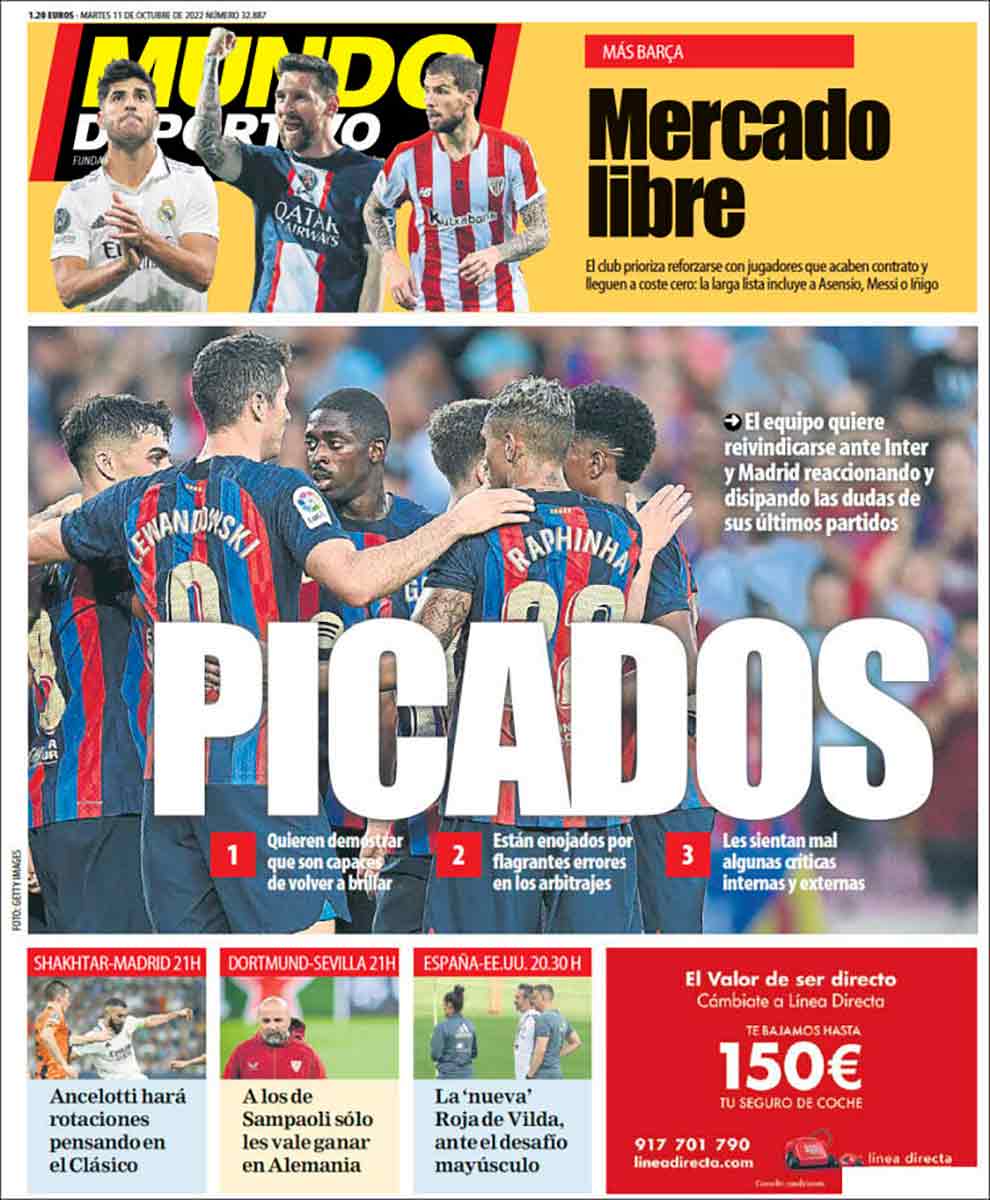 Mundo Deportivo elige como titular la palabra “Picados”, pero no habla de vinos, sino que hace referencia a los futbolistas del Barça. Al parecer los chicos están enojados por los “flagrantes errores en los arbitrajes”. Uno se ríe cuando se lo plantea en perspectiva. Y también “les sientan mal algunas críticas internas y externas”. Pobrecitos, jóvenes sin los problemas cotidianos del resto que se dedican a jugar y que no son capaces de asumir la crítica. Vamos, como un adolescente con pavo tardío y el pelo morado.