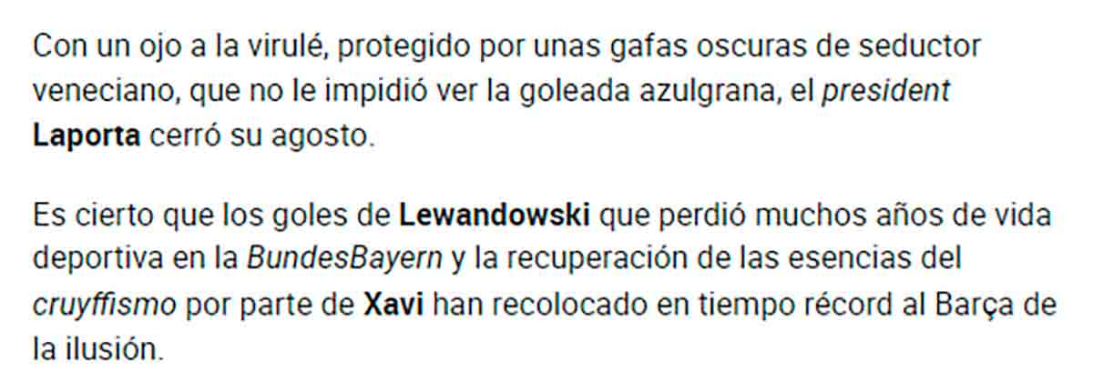 Ojo, que Laporta luce “gafas de seductor”. Guau. Gafas que cubren su ojo a la virulé, pero ya sabéis, en tierra de ciegos, el tuerto es el rey. Atentos, porque Lewandowski perdió muchos años de vida deportiva en la BundesBayern. Enchufándole junto a sus compañeros ocho goles a los cules o ganando Champions, Supercopa de Europa y Mundial de Clubes, entre otras “pérdidas de tiempo”. Xavi ha recuperado las esencias del cruyffismo. Y dice esencias porque los datos reales dicen que Xavi no es precisamente uno de los mejores entrenadores que se ha sentado en el banquillo culé. Pero claro, está la ilusión, y todos sabemos que teniendo ilusión, ¿quién narices quiere ganar Champions?
