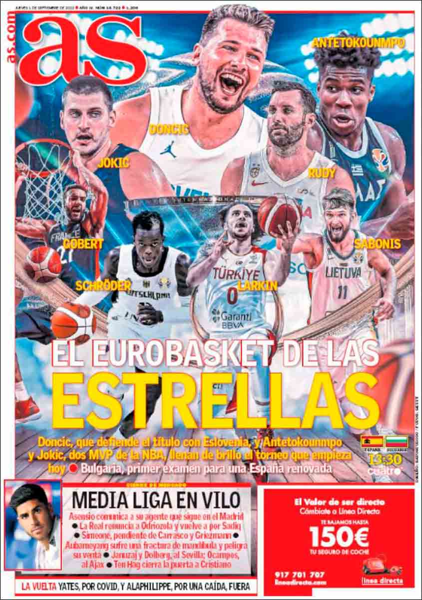 De las portadas, la más destacable es la de Marca, protagonizada por una entrevista exclusiva a Pablo Laso. El exentrenador del equipo blanco afirma que pese a que su salida no fue como él hubiese deseado, será madridista toda la vida y no dudaría en volver al Madrid si Florentino le llamase, dice que siempre ha mantenido una estupenda relación con él.