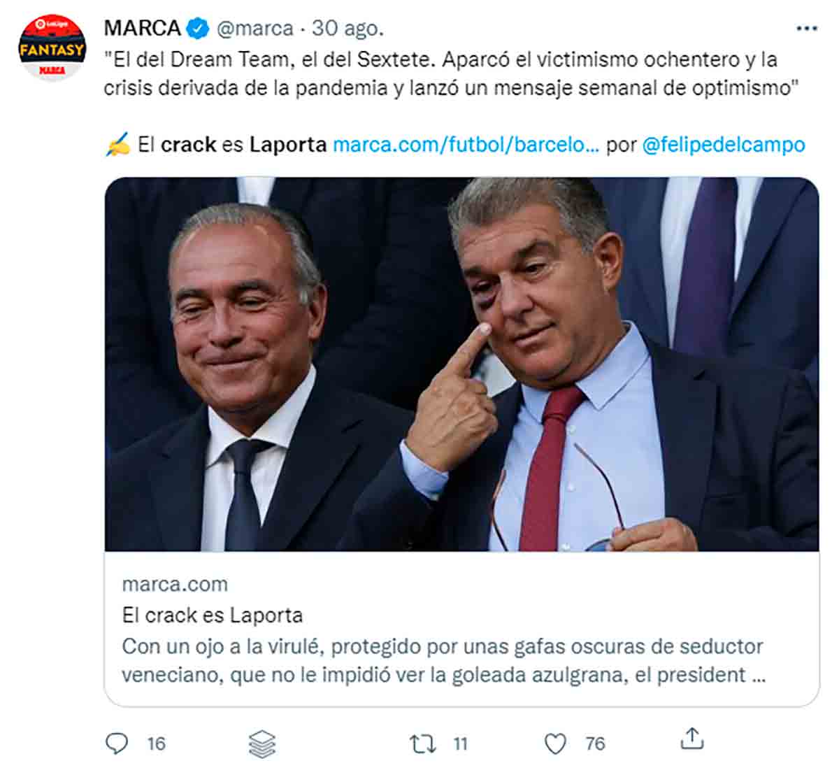 Pero este panegírico laico con aroma de publirreportaje centra sus elogios en el único e incomparable Jan Laporta: “… ninguno de los tres estarían sin el liderazgo de Laporta. De la pancarta a la palanca ha sabido transmitir el regreso del Barça contemporáneo. El del Dream Team, el del Sextete. Aparcó el victimismo ochentero y la crisis derivada de la pandemia y lanzó un mensaje semanal de optimismo. El de la pelea por una Liga imposible o el de reinar el mercado de fichajes, rebautizó las viejas hipotecas por joviales palancas y puso una sonrisa al tenebroso grupo de la Champions”. Quien no se ría es porque no quiera.