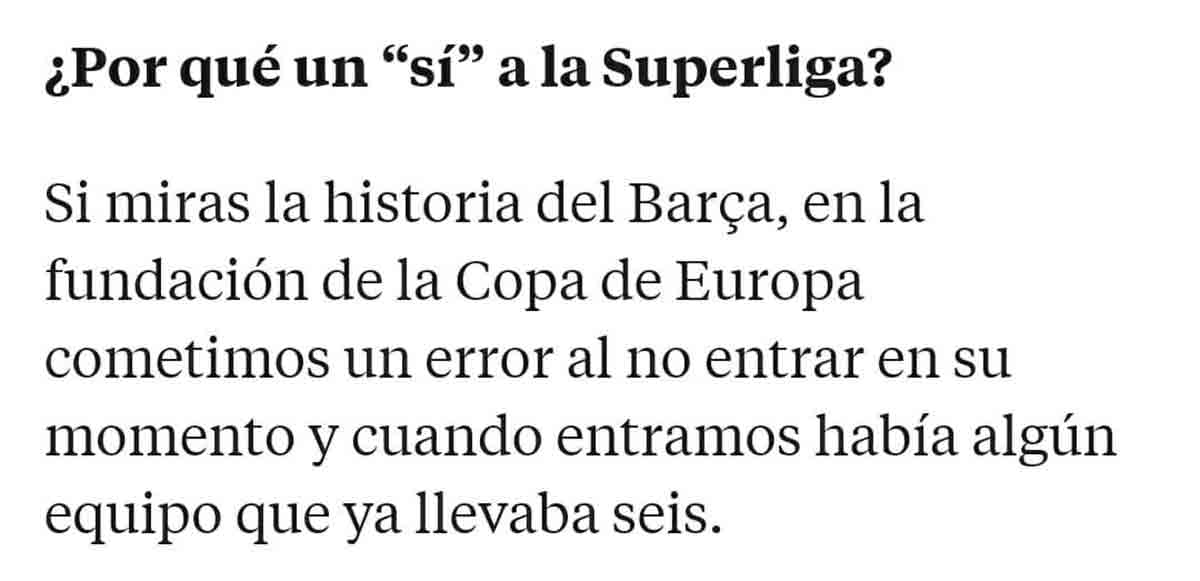 Laporta acierta, pues, al comparar la magnitud del error histórico de quedar fuera de la primera Copa de Europa con el que supondría quedar fuera de la incipiente Superliga, pero de rondón trata de hacer colar la especie de que esas primeras Copas de Europa el més que un club no las gana porque no quiere, cuando la única verdad es que no las gana (y en algunos casos ni las disputa) por su propio fracaso deportivo, en contraste con los triunfos resonantes del Madrid.