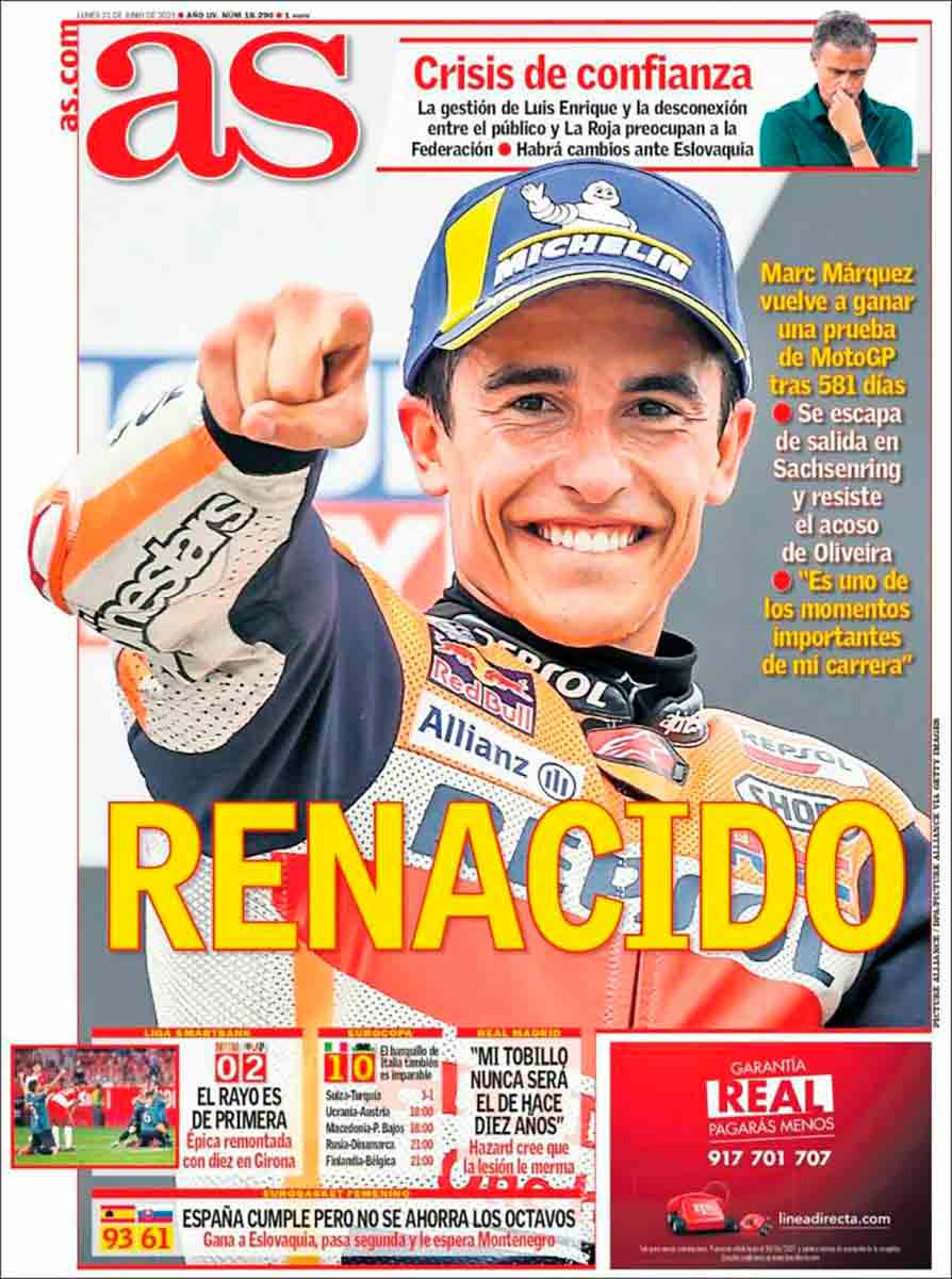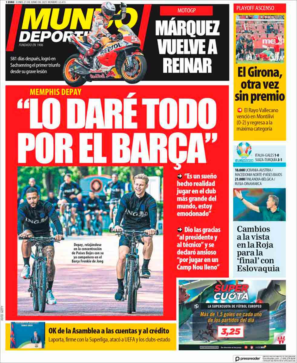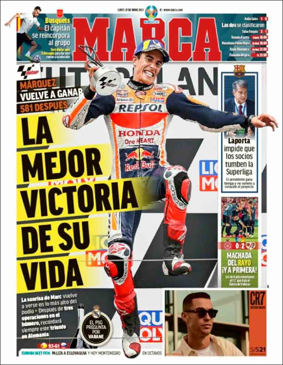 Las otras dos portadas del día van sobre dos ruedas: Marc Márquez que vuelve a ganar en Moto GP (enhorabuena) y el Barça que ficha al penúltimo rey de la montaña del Tour de los Países Bajos.