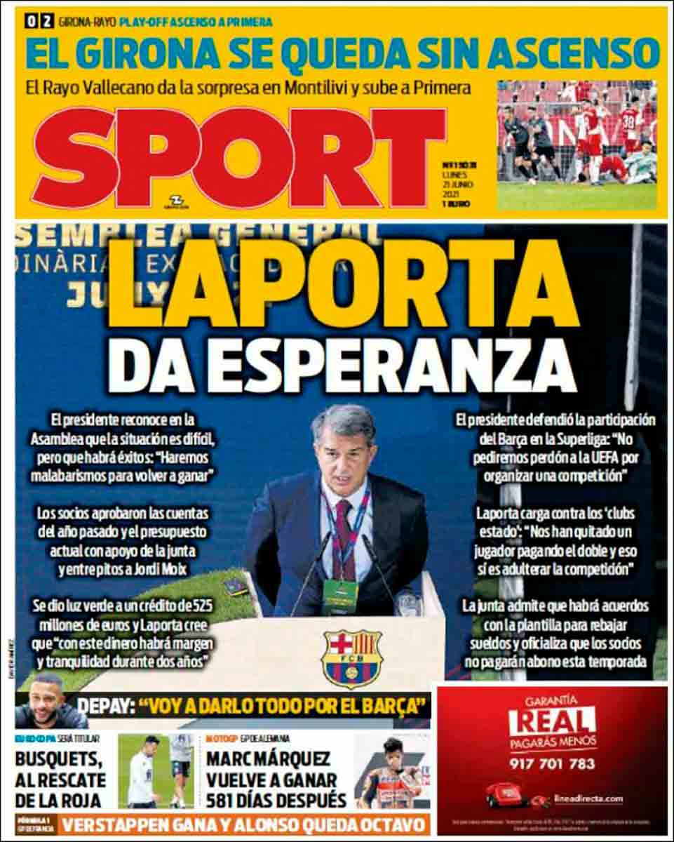 El hecho es que Laporta, con buen criterio, no sometió a la Asamblea la decisión sobre la Superliga. Observad cómo Marca, que resalta en portada el ascenso heroico del Rayo (enhorabuena, rayistas), enfoca este particular.