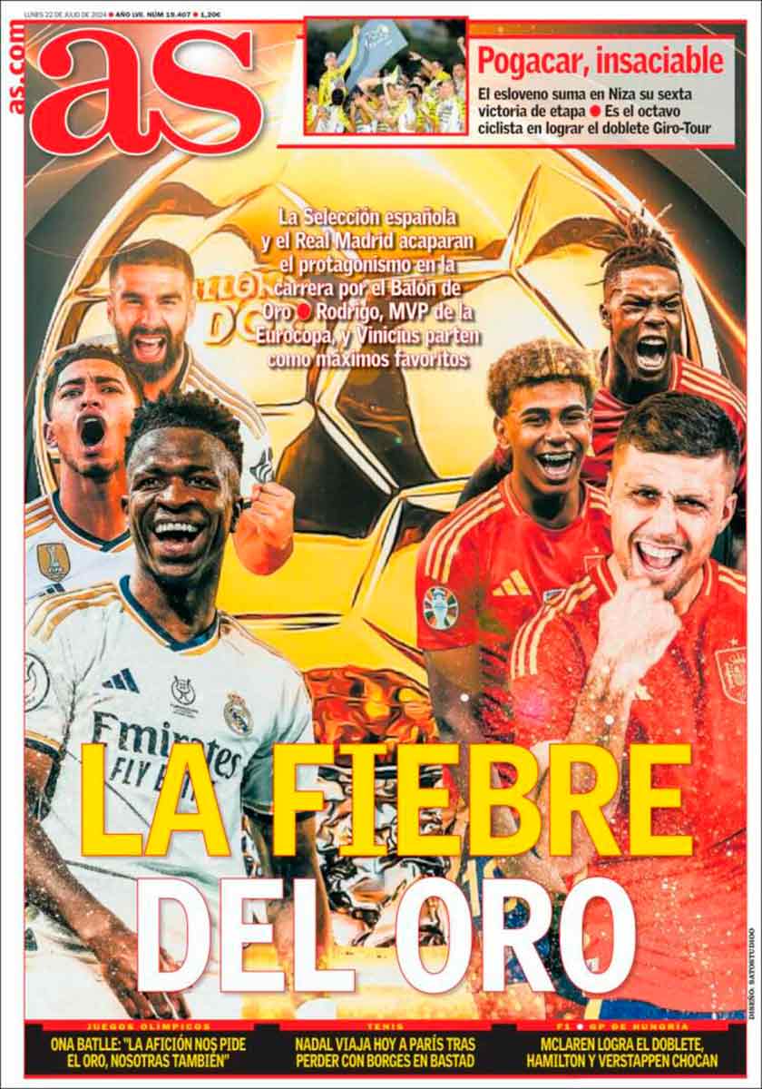 As viene con una de esas portadas confeccionadas con una paleta de colores postapocalíptica y salpicaduras de Ferrero Rocher. La idea que quiere transmitir el diario de PRISA es que el Madrid y la selección española son enemigos. En esta ocasión, la lucha es por el Balón de Oro.