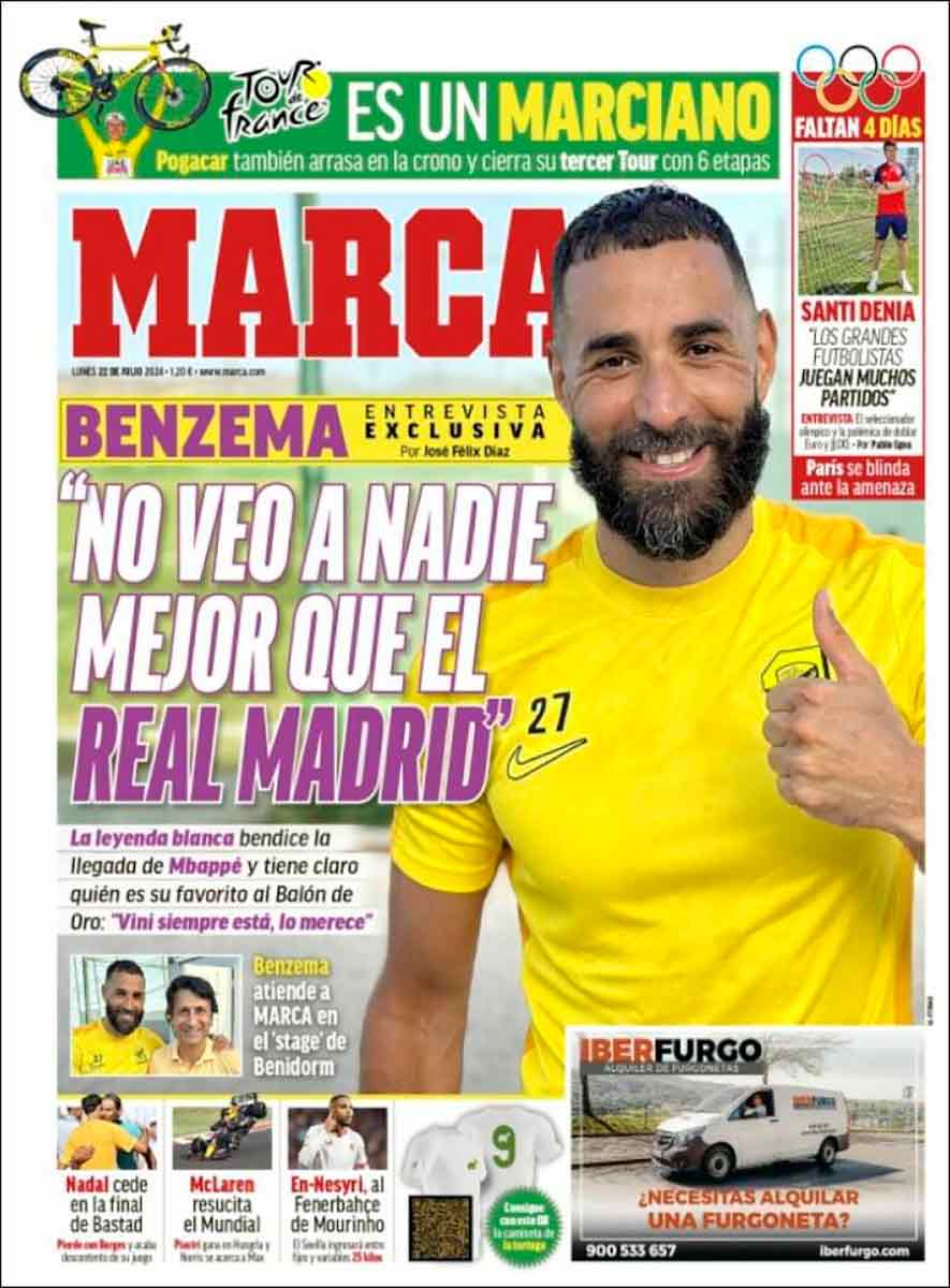 Aparece Benzema vestido de Betadine. Por fin una portada habla del Madrid, aunque sea de manera tangencial y desde el exterior, aunque no mucho, concretamente desde Benidorm, lugar mencionado con anterioridad.