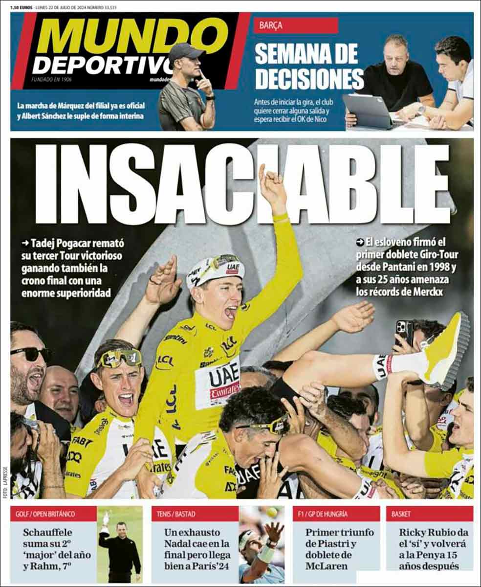La foto de la primera plana es para un muchacho joven manteado por otros mozos. Se aprecia jolgorio y podemos leer: «Insaciable». De primeras, pensamos que se refiere a un guiri en Benidorm con una pulsera de todo incluido para un hotel que dispense galones de de sangría de garrafa. Pero no, se trata de Pogacar, ganador del Tour. Esloveno, pero ha quedado primero.